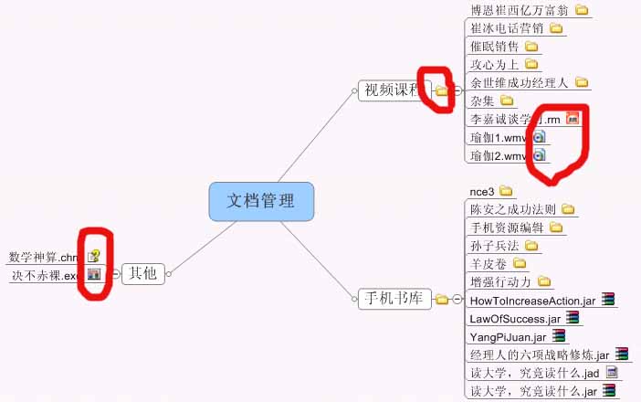 6、每次启动电脑后,用导图软件打开这张图后,要用哪个文档就在图上直接点击文件名旁边的图标,立刻可以打开,若干级目录结构全部放到了同一个平面,藏得再深的文档都只需要一键就打开了。试试吧