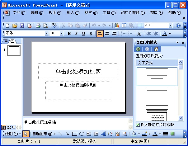 ② 在窗格中用鼠标单击要应用于演示文稿的模板,所选中的设计模板即可应用在当前的幻灯片中,如图所示。