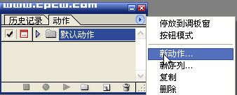 提示:如果原始图片的构图、色彩不够理想,可先对原始图片进行裁剪、色彩校正后再进行动作设置。 2.点击“动作”面板右边的三角形按钮,在弹出菜单中选择“新动作”命令。