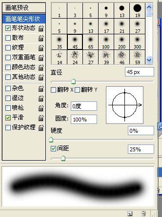 1、选择画笔,打开画笔预设面板,选择画笔形状,我用的是 柔角45 选择形状动态 大小抖动稍微调一下就好了。
