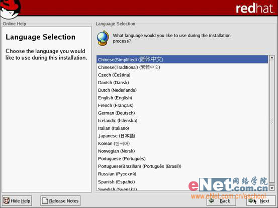 第四步:检测完光盘后会出现Linux的软件介绍说明以及选择系统语言的对话框,选择“简体中文”,当然如果你精通别的语言也是可以选择其他语言进行安装和使用的。