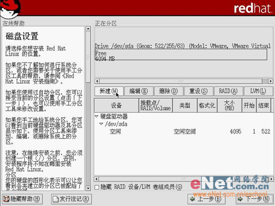 第八步:新建分区。在图形界面下比较直观,一般都会显示出你硬盘的容量,厂商等相关信息。直接点击“新建”来创建新的分区。