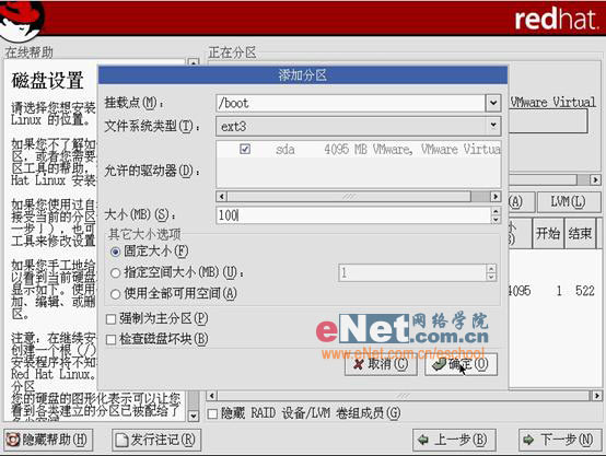 第九步:创建完新的分区之后,需要添加一个/boot分区(类似Windows的引导分区),类型为ext3,单击“确定”。