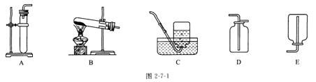 (2)实验装置:实验装置包括发生装置和收集装置。①发生装置的选择依据;根据反应物、生成物的状态和反应条件选择。如果选用过氧化氢和二氧化锰制取氧气,应用固体与液体反应且不需要加热型的装置,则选择图2-7-1A装置,如果选用加热高锰酸钾制取氧气,应用固体加热型装置,则选择图2-7-1B装置。