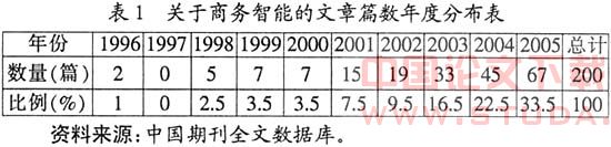 (1)数量分布统计分析。笔者利用清华同方中国期刊全文数据库检索系统(Web),分别以“商业智能”、“商务智能”为检索题进行篇名检索,得到221篇文章(论文、简讯等),通过内容分析,除去内容重复的和明显不符合我们主题的文章,得到以下统计结果(见表1)。