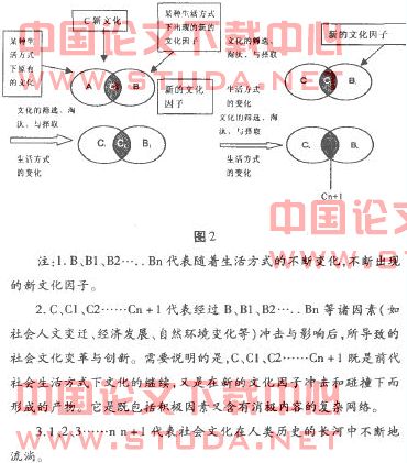 但文化的整合不只是一个同心圆的扩散,而是无数个圆圈的相互交流与传承。因为人类的生活方式还在不断向前继续,文化变迁是个永恒的现象。在文化变迁过程中,有的文化吸收了其他文化中有用成分,有了新的发展,有的文化则表现出衰弱之势,有的甚至消失。可见它是通过传播、认同、涵化、变迁、顺应这一变异机制来进行的。下面笔者使用数学中集合的图示来说明之。见图2