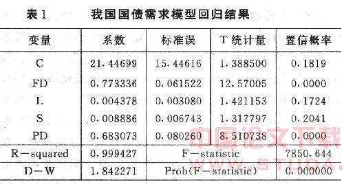 国债规模的大小在客观上受到很多宏观经济因素的制约和影响,根据Granger因果检验的结果,本文得到与国债规模(C),具有长期的协整关系的四个影响因素,即财政赤字(FD)、信贷规模(L)、居民储蓄(S)和国债还本付息(PD)。本文采用这四个因素作为国债规模回归模型中的解释变量,根据1981~2003年的历史数据,运用OLS回归法,建立我国国债的需求模型。