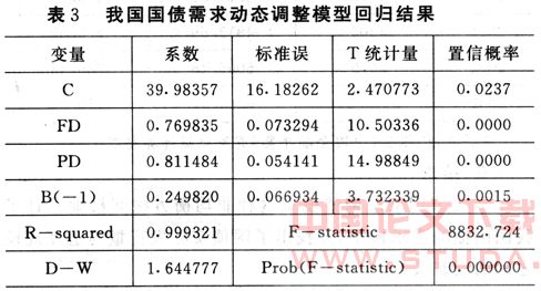 如果假定国债的实际发行量与需求量是一致的,那么上述回归方程就是国债需求函数的均衡方程,否则上述所拟合的回归方程就不能代表需求方程,它只是我国国债发行量的回归方程。因为国债的实际发行量与需求量一致是很偶然的,大多数年份实际发行量和需求量是不一致的,所以必须对上述方程进行动态调整,才能得到我国国债发行规模的实际需求模型。
