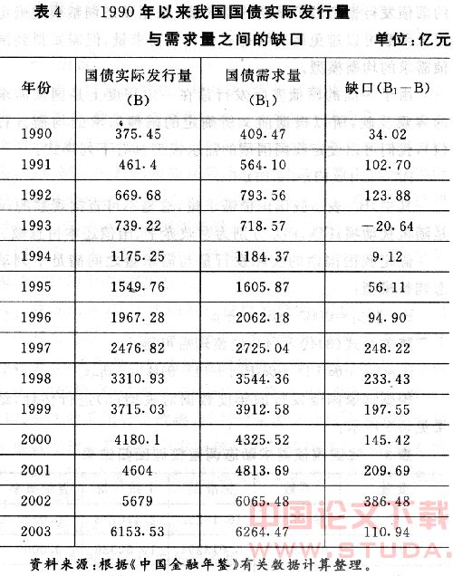 根据我国国债需求模型(7)可以算出1990年以来我国国债需求量,再与当年实际发行量相比,可以得出各年度我国国债发行的缺口,如表4所示: