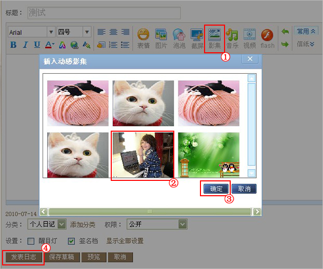 第四步:在高级模式里,点击“影集”选择您要插入的动感影集,点击“确定”,之后发表日志即可。